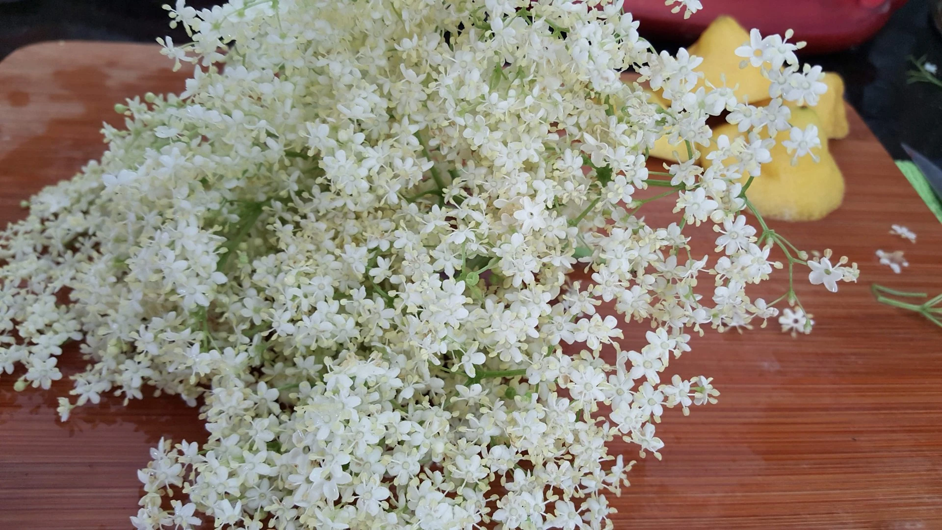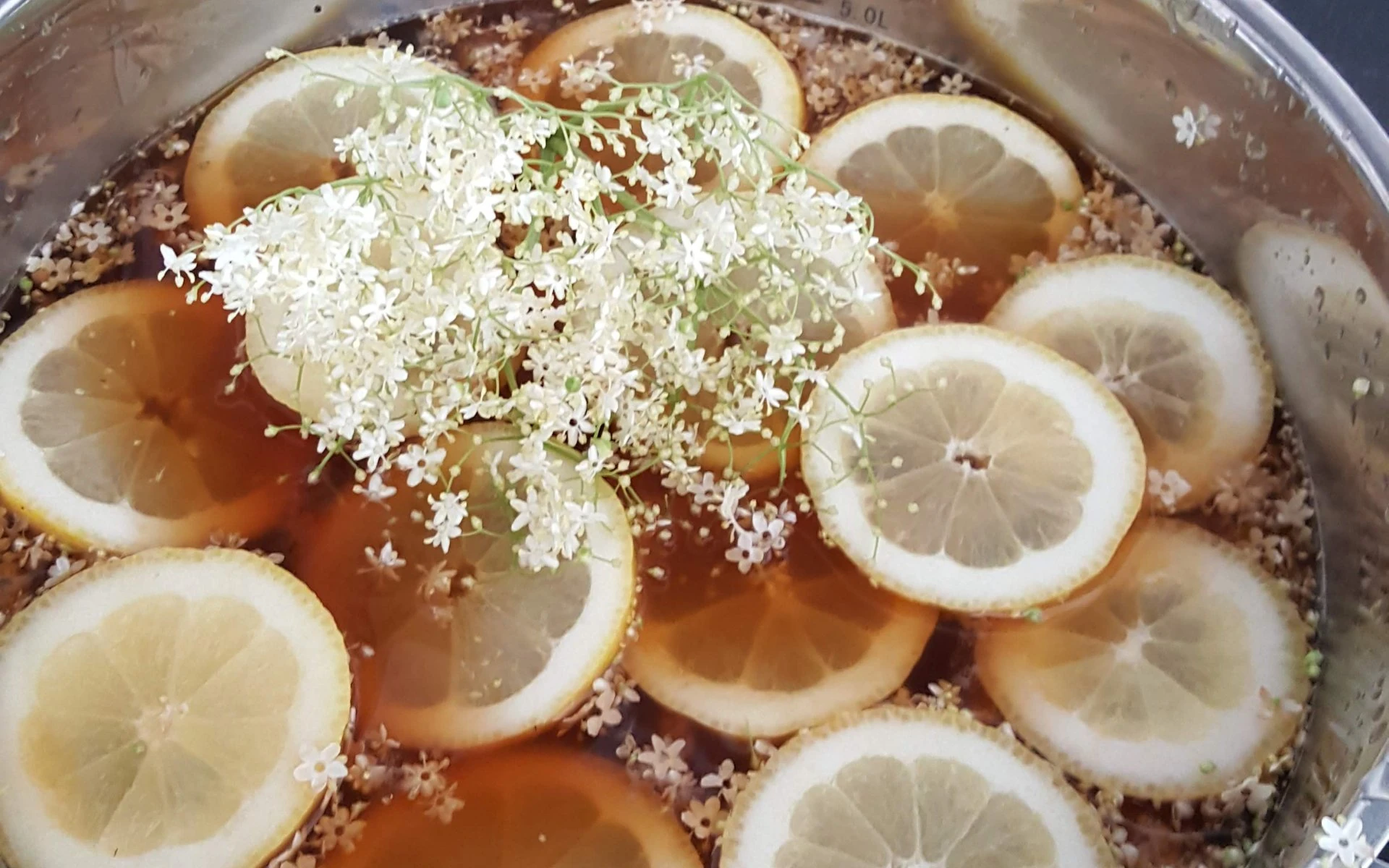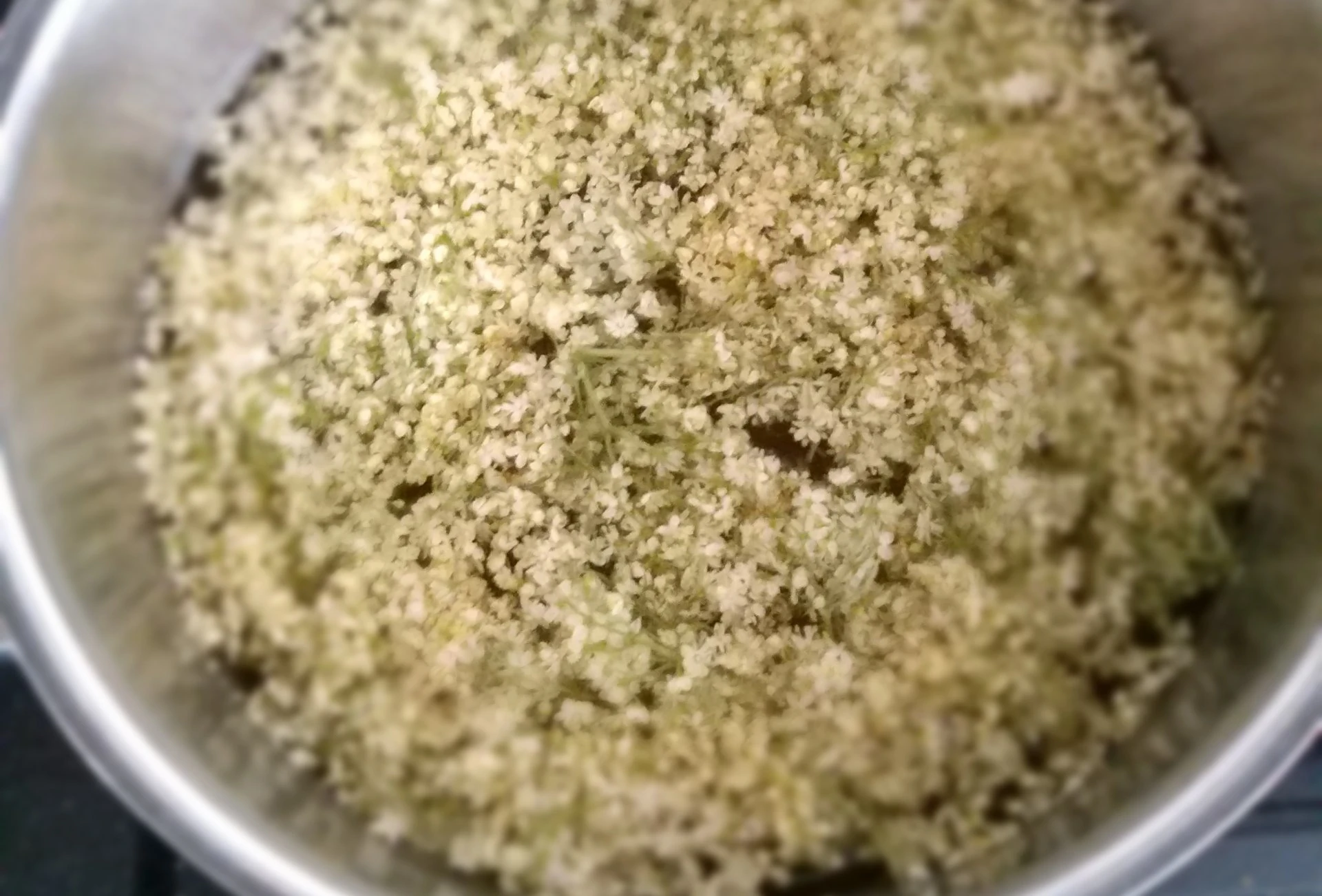 - Doe 4 liter water in een ruime, brandschone pan of emmer en doe daar de vlierbloesempjes bij.