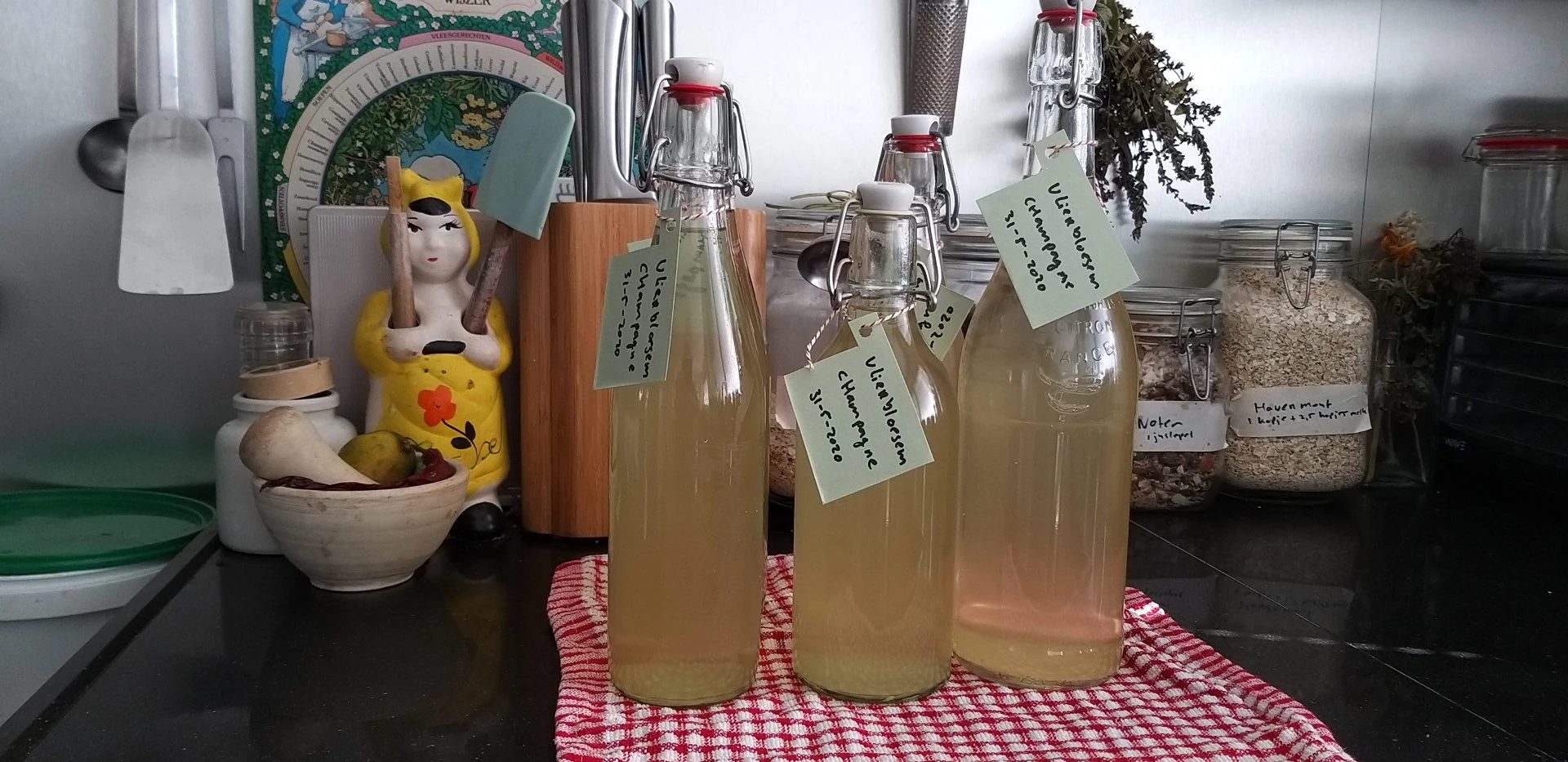 Ach ja, vlierbloesemchampagne… wie kent het niet? Nou, ik dus en daarom besloot ik vorig jaar zelf een poging te wagen tot het maken van dit bijzondere drankje waarover ik veel lovenswaardigs had gelezen. Ik verwachtte er weinig van. Water, suiker, vlierbloesems, witte wijnazijn en citroen. Dat was het hele recept. Voor de zekerheid besloot ik er dus toch maar wat extra champagnegist aan toe te voegen om het geheel wat meer ‘prik’ te geven. Dat hebben we geweten… Bij de NASA vragen ze zich nu nog steeds af waar die kurk toch vandaan kwam die plotseling rakelings langs het raampje van ruimtestation ISS schoot…