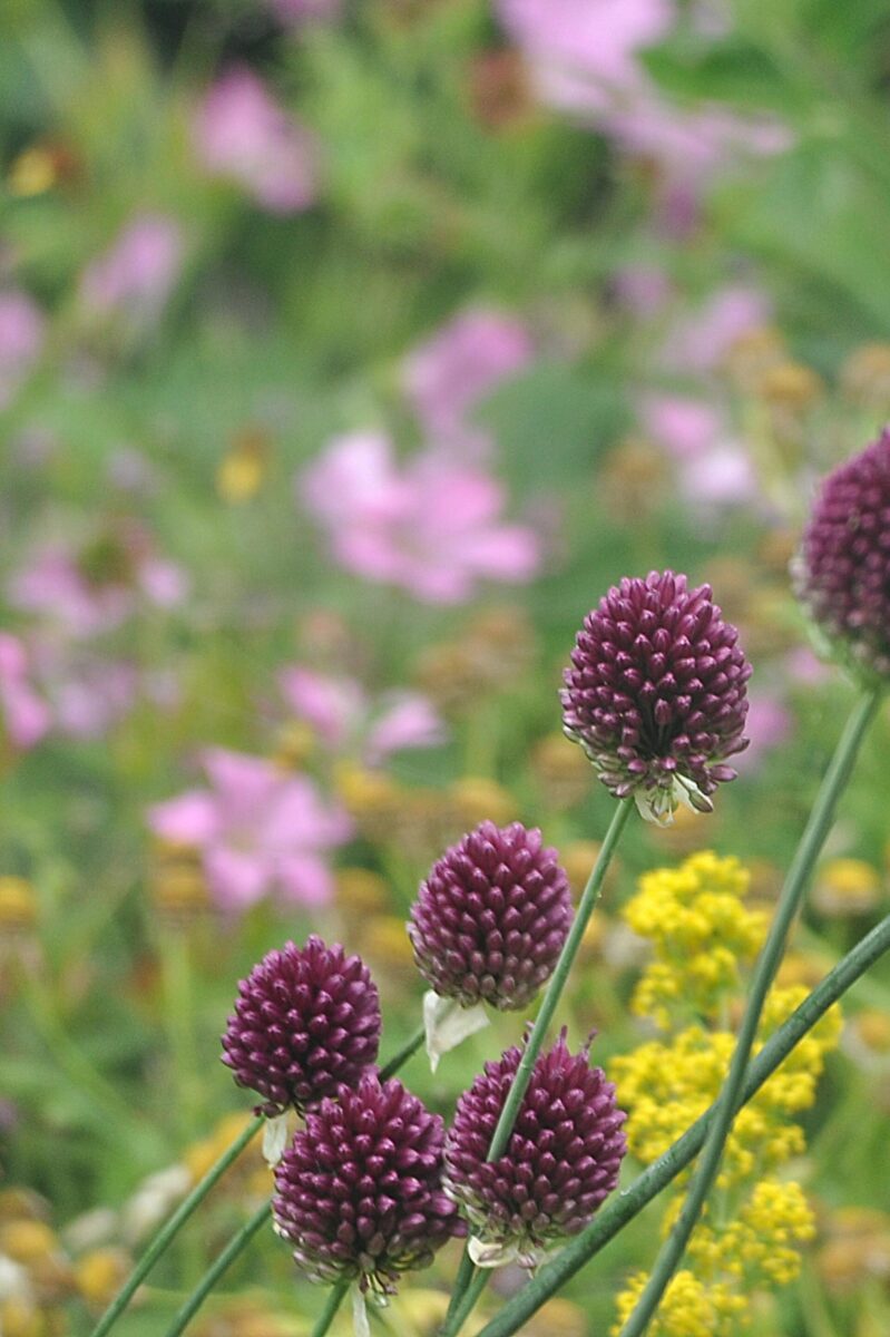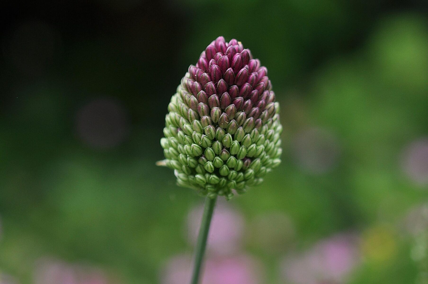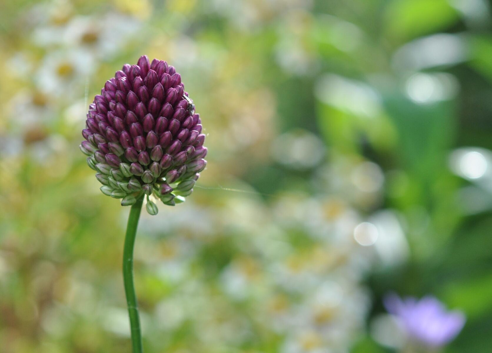 Nee. Dit is geen sierui of bieslook, dit is het Trommelstokje, ook wel bekend als Kogellook. Een oersterk (bio) bolletje dat in juni tot en met augustus bloeit met prachtige roze tot donker purperkleurige bloemetjes dicht opeen in een eivormige knop op een lange dunne steel van zo’n 20-80 cm hoog. Altijd prachtig om te zien hoe zo’n lookknop zich langzaam maar zeker uit zijn omhullende jasje wringt. Dat jasje is een wat doorzichtig groen vlies dat in het voorjaar om de hele knop heen gevouwen zit. Als je er met warm weer naar kijkt zie je die opeengepakte bloemetjes echt zweten en bewegen om die jas weg te drukken. Bijzonder…