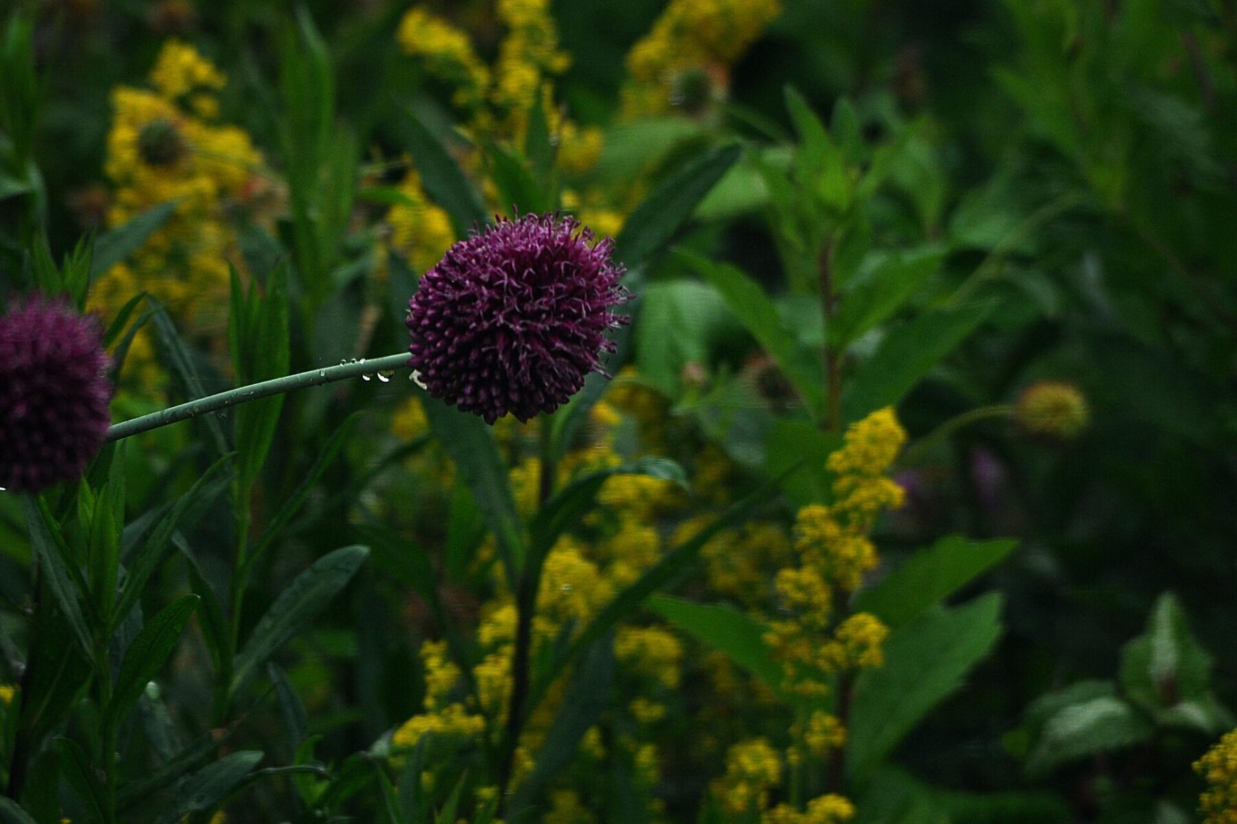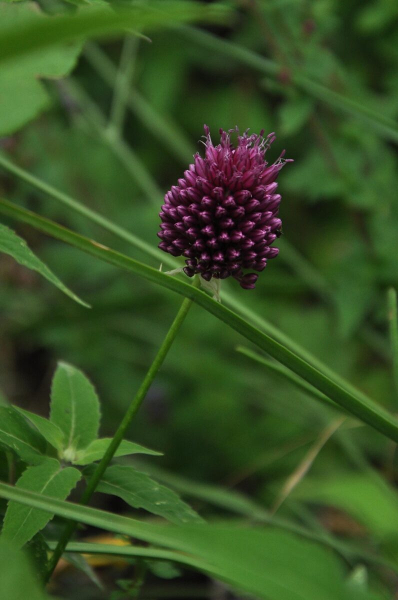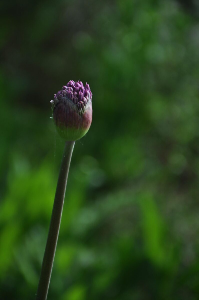 Nee. Dit is geen sierui of bieslook, dit is het Trommelstokje, ook wel bekend als Kogellook. Een oersterk (bio) bolletje dat in juni tot en met augustus bloeit met prachtige roze tot donker purperkleurige bloemetjes dicht opeen in een eivormige knop op een lange dunne steel van zo’n 20-80 cm hoog. Altijd prachtig om te zien hoe zo’n lookknop zich langzaam maar zeker uit zijn omhullende jasje wringt. Dat jasje is een wat doorzichtig groen vlies dat in het voorjaar om de hele knop heen gevouwen zit. Als je er met warm weer naar kijkt zie je die opeengepakte bloemetjes echt zweten en bewegen om die jas weg te drukken. Bijzonder…