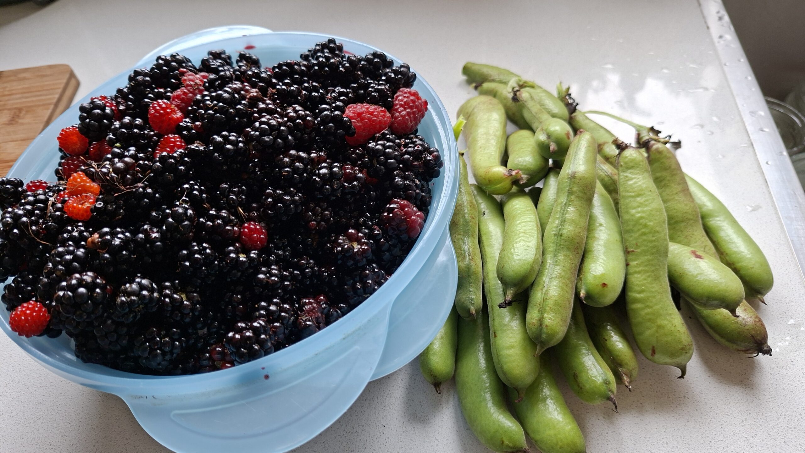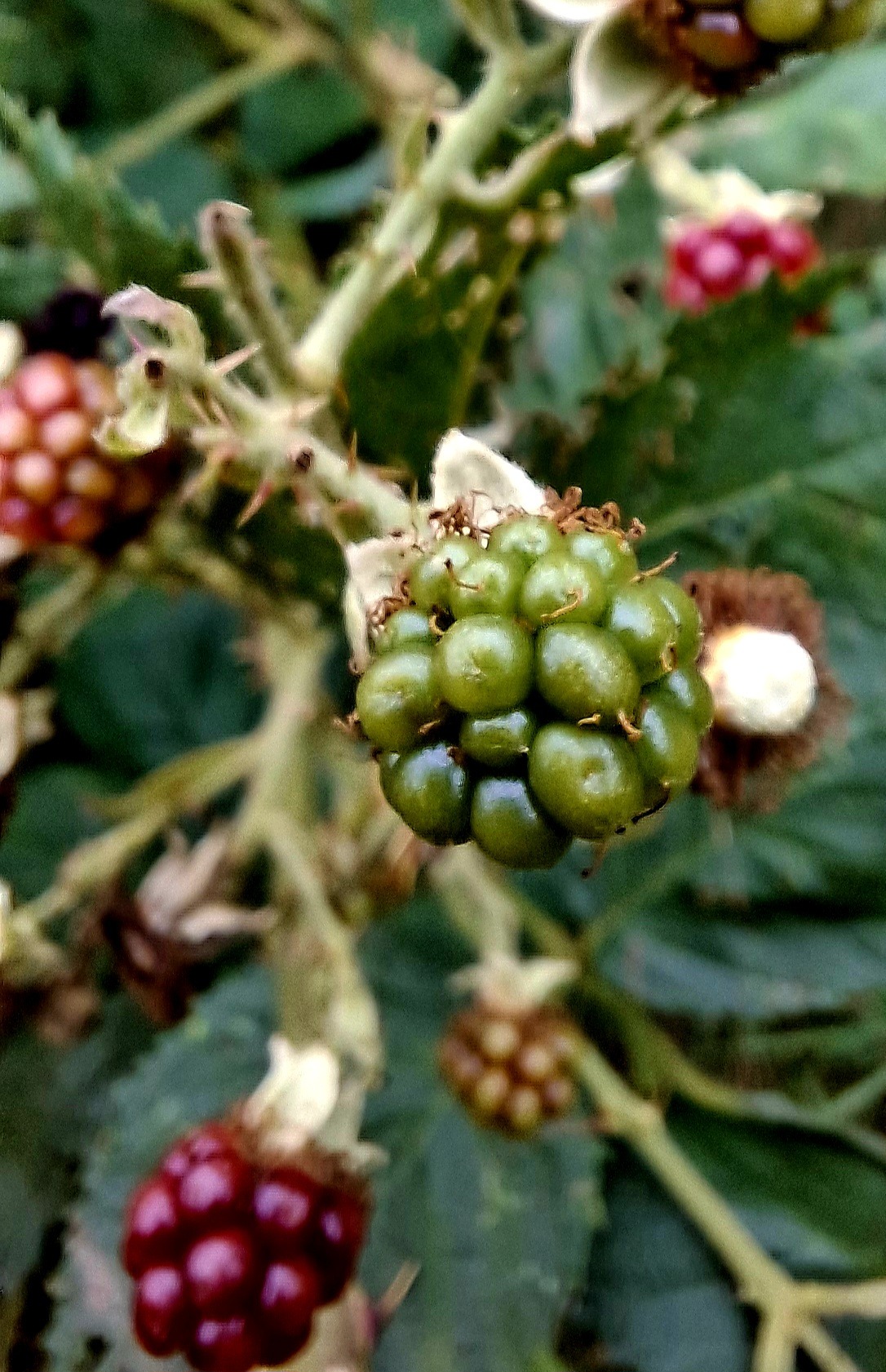 Aan de andere kant was ik dit jaar superblij met de woekerende braamstruiken op ons ‘ruige stukje’, dat is het stuk grond helemaal achter op het land waar we de restanten van onze sloop en graafwerkzaamheden zichzelf omtoveren in heuse ‘dutch mountains’. Binnen de kortste keren groeide op dat stuk niemandsland allerlei in- en uitheemse planten, wilde bloemen, ontelbare grassoorten, zuring, brandnetels, afgedankte laurierkersen en ander overtolligs uit mijn tuin. En dus ook een wilde braam. Dat werd al snel een heuvel vol ongecontroleerde priktakken waar nauwelijks tegenop te snoeien viel en waar weinig aan te beleven leek.