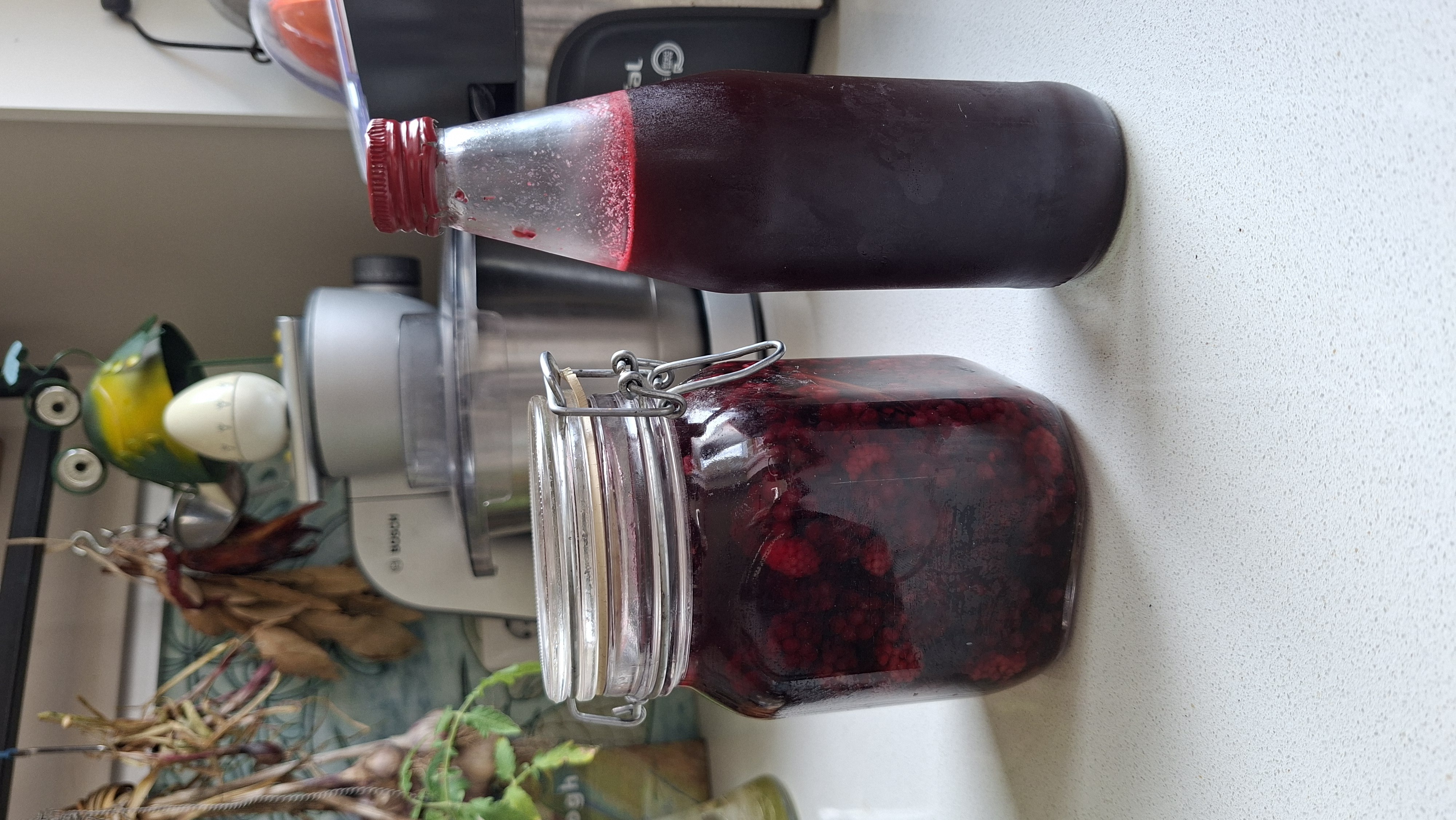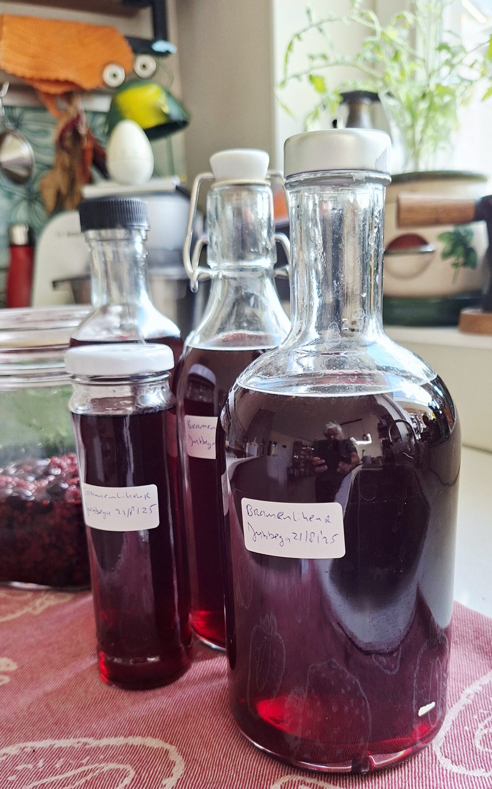 Behalve mijn bekende Bramensorbet , 16 potten overheerlijke bramenjam (250 gr. halfvolle geleisuiker per pond bramen plus nog wat frambozen, bessen en aardbeien uit de tuin) had ik ook genoeg voor wat bijzondere drankjes. De recepten staan hieronder.